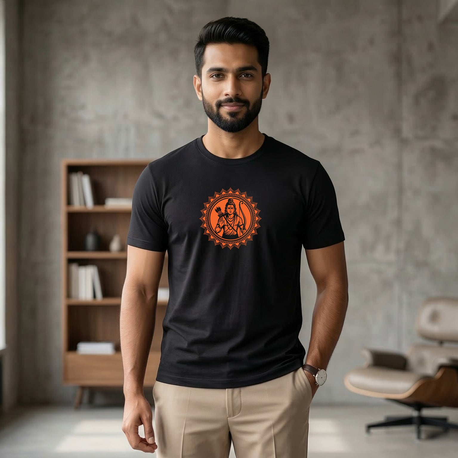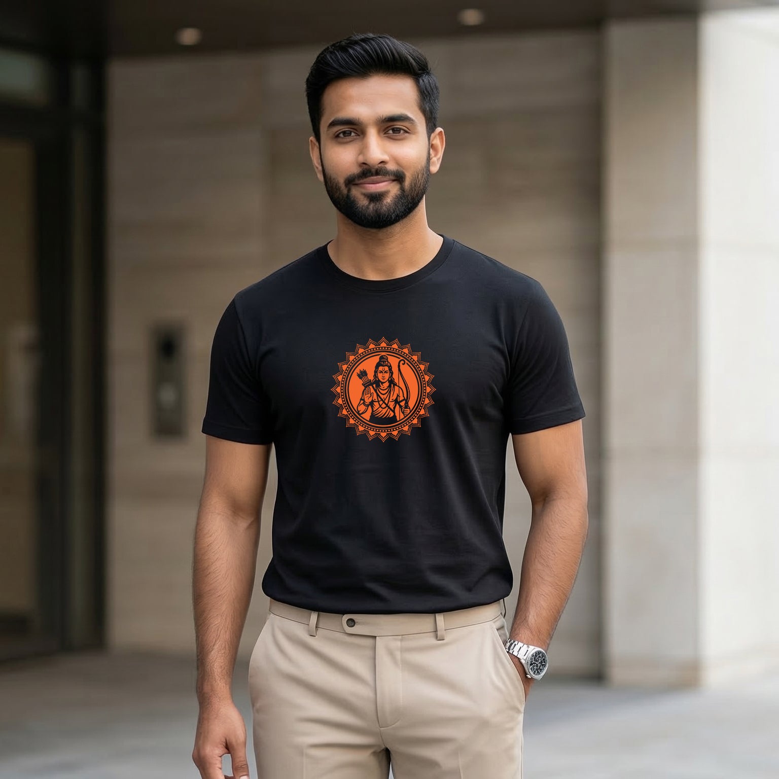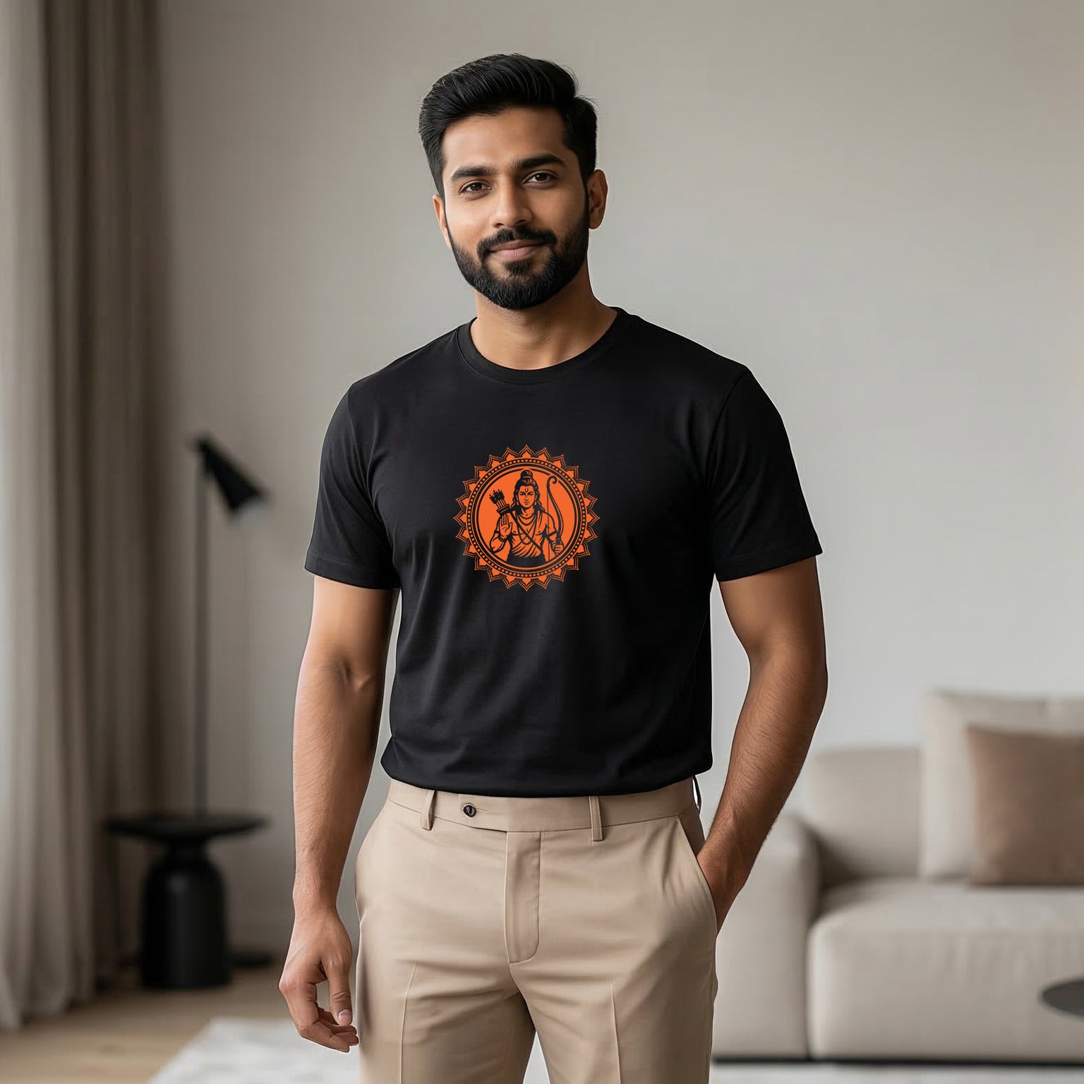 The ShortTall Lord Ram Sacred Emblem T-Shirt features a powerful artistic representation of Lord Ram, symbolizing righteousness, courage, and devotion. The detailed circular emblem design highlights Lord Ram holding the bow and arrow, representing strength, protection, and the victory of good over evil.
