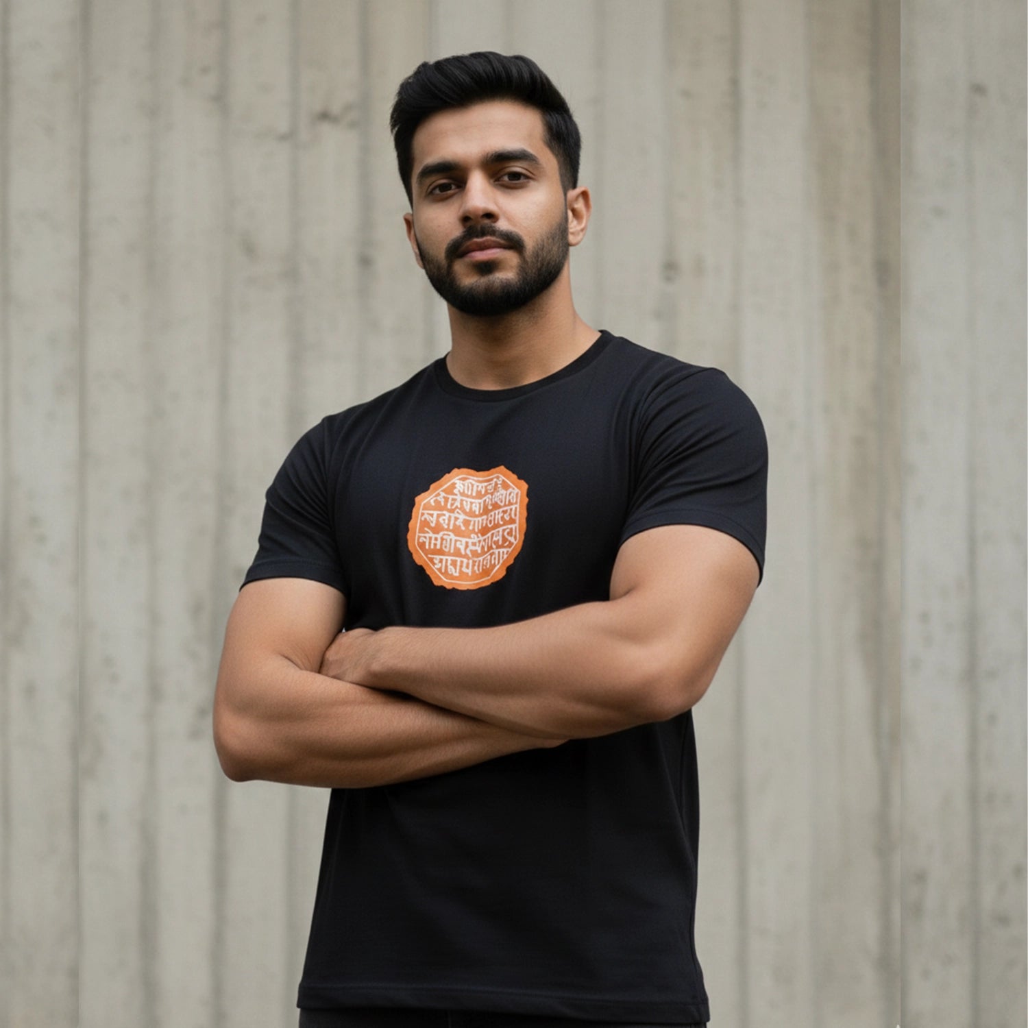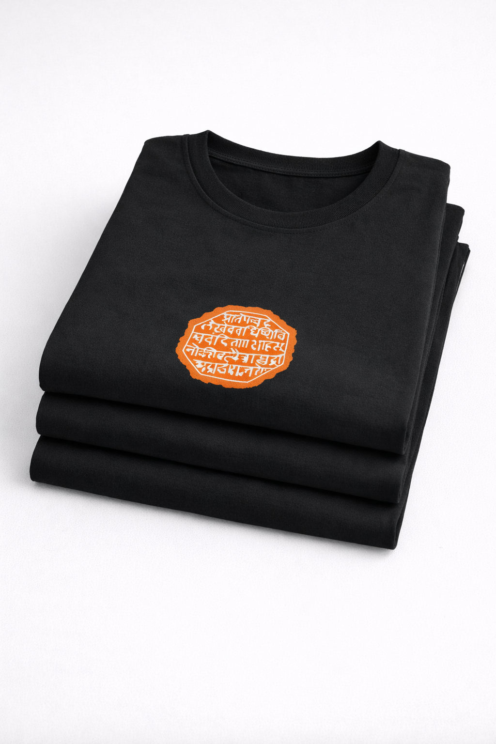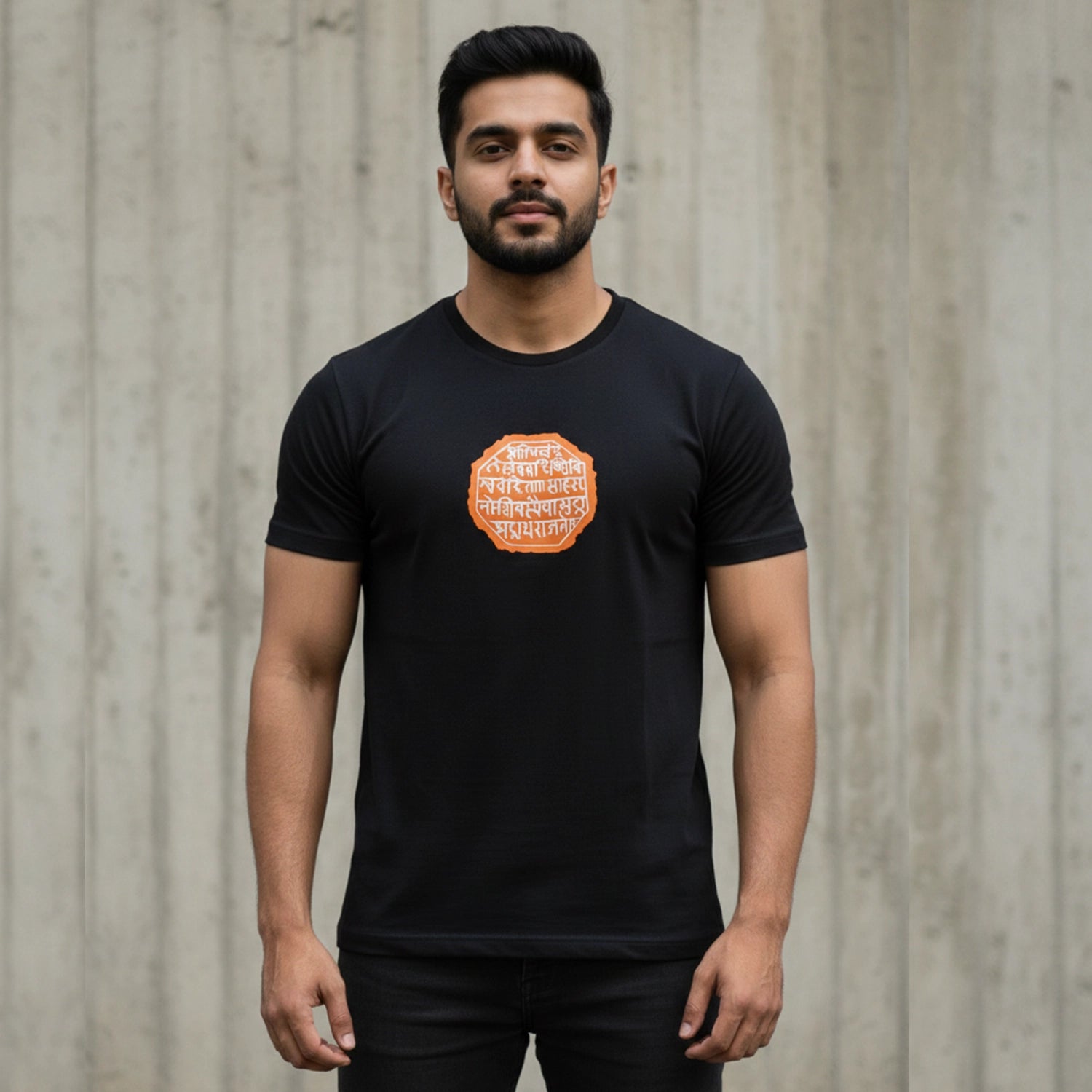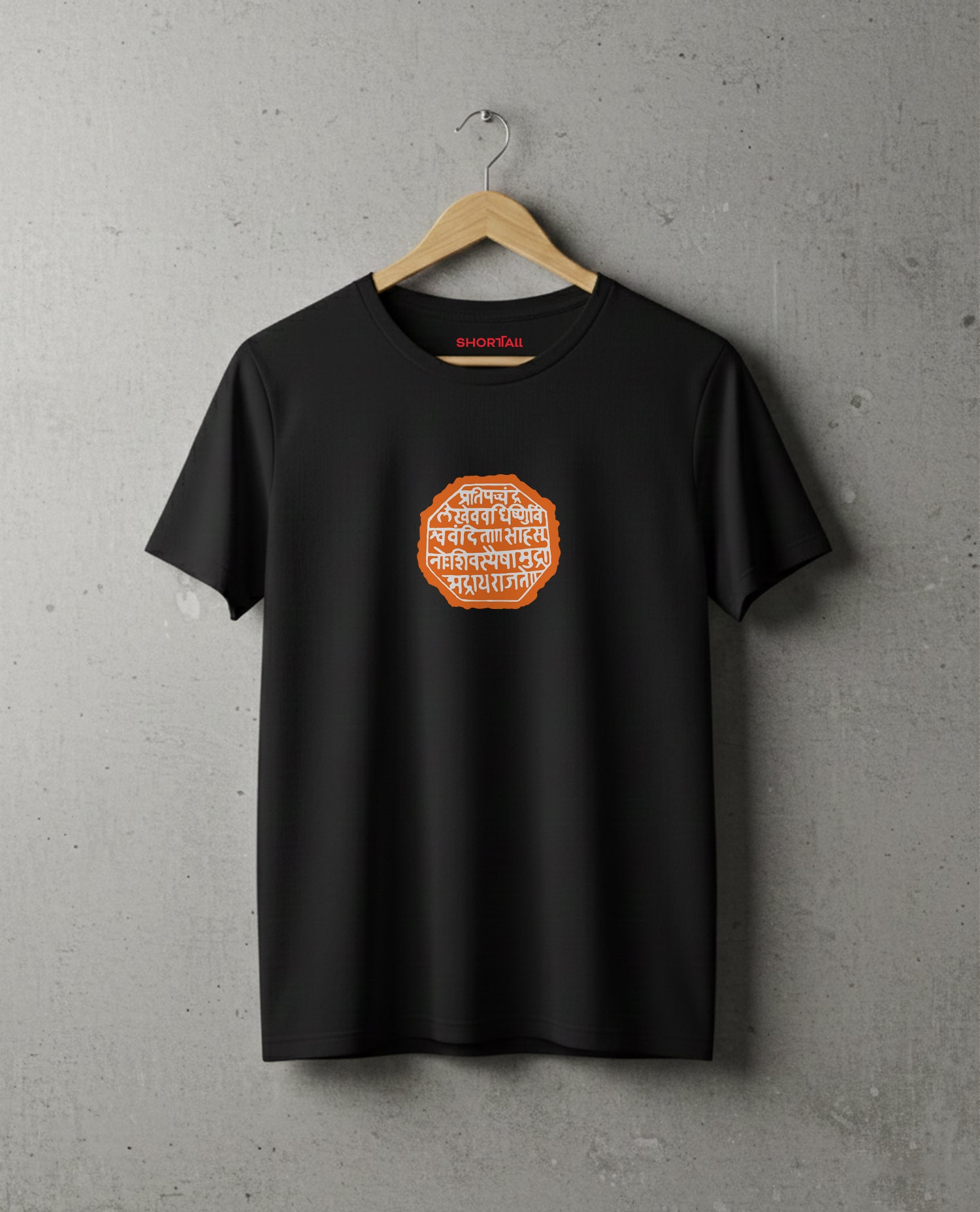 The Rajmudra tee draws inspiration from historic Marathi script and cultural symbolism. Bold yet refined, this design bridges tradition and modern fashion — a statement of identity, strength, and legacy.