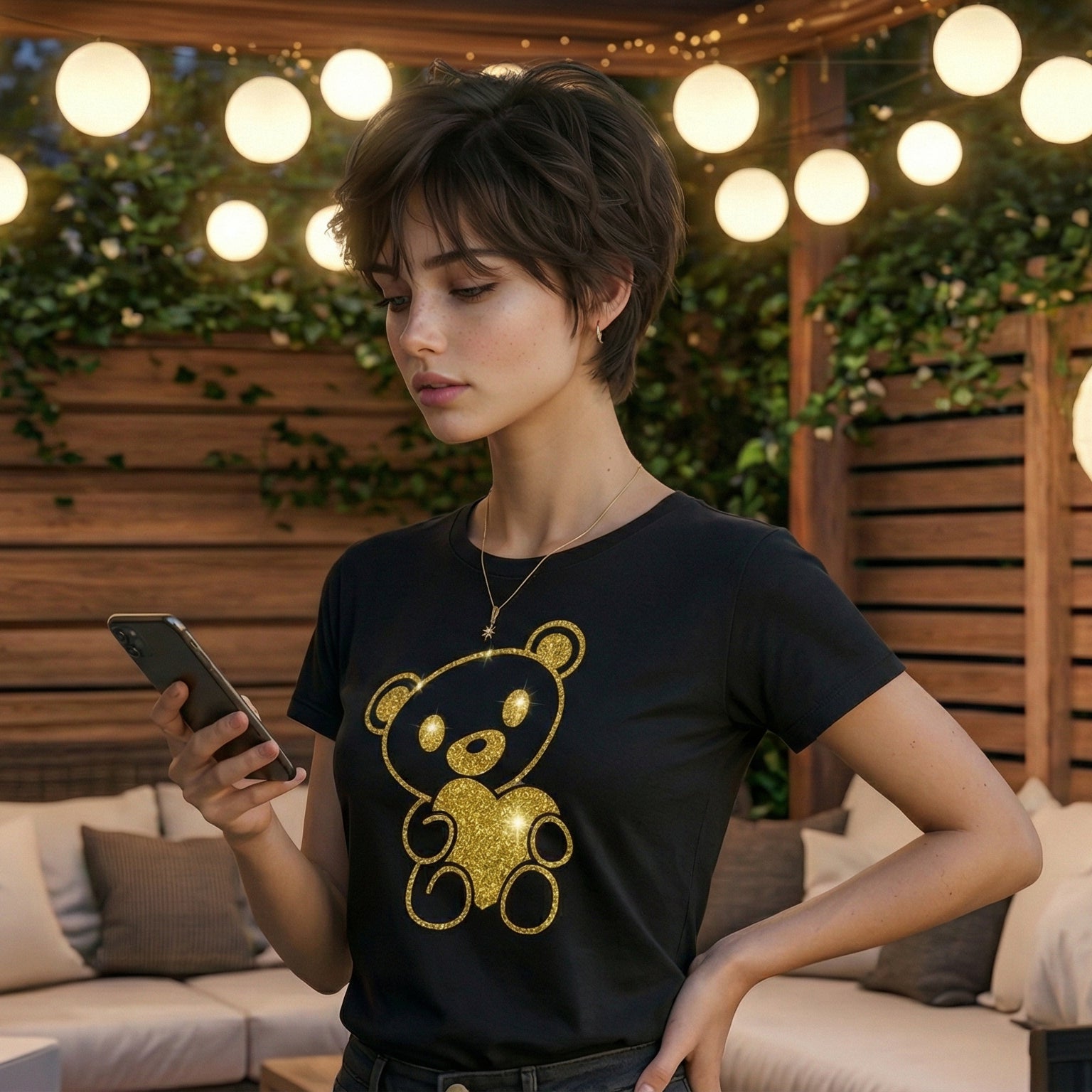 The “Golden Teddy” Sparkle Luxe Edition tee brings charm and shine together in one statement piece. Featuring a glitter-finish golden teddy design on a sleek black base, this tee adds warmth, personality, and a touch of glam to your everyday look.