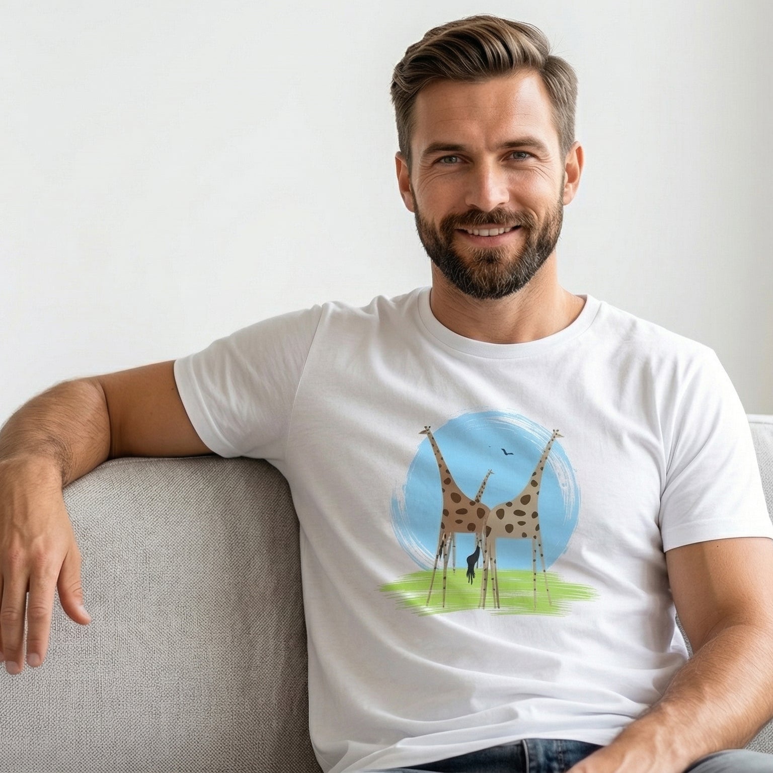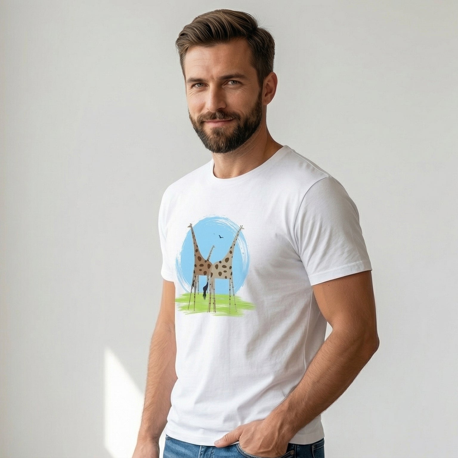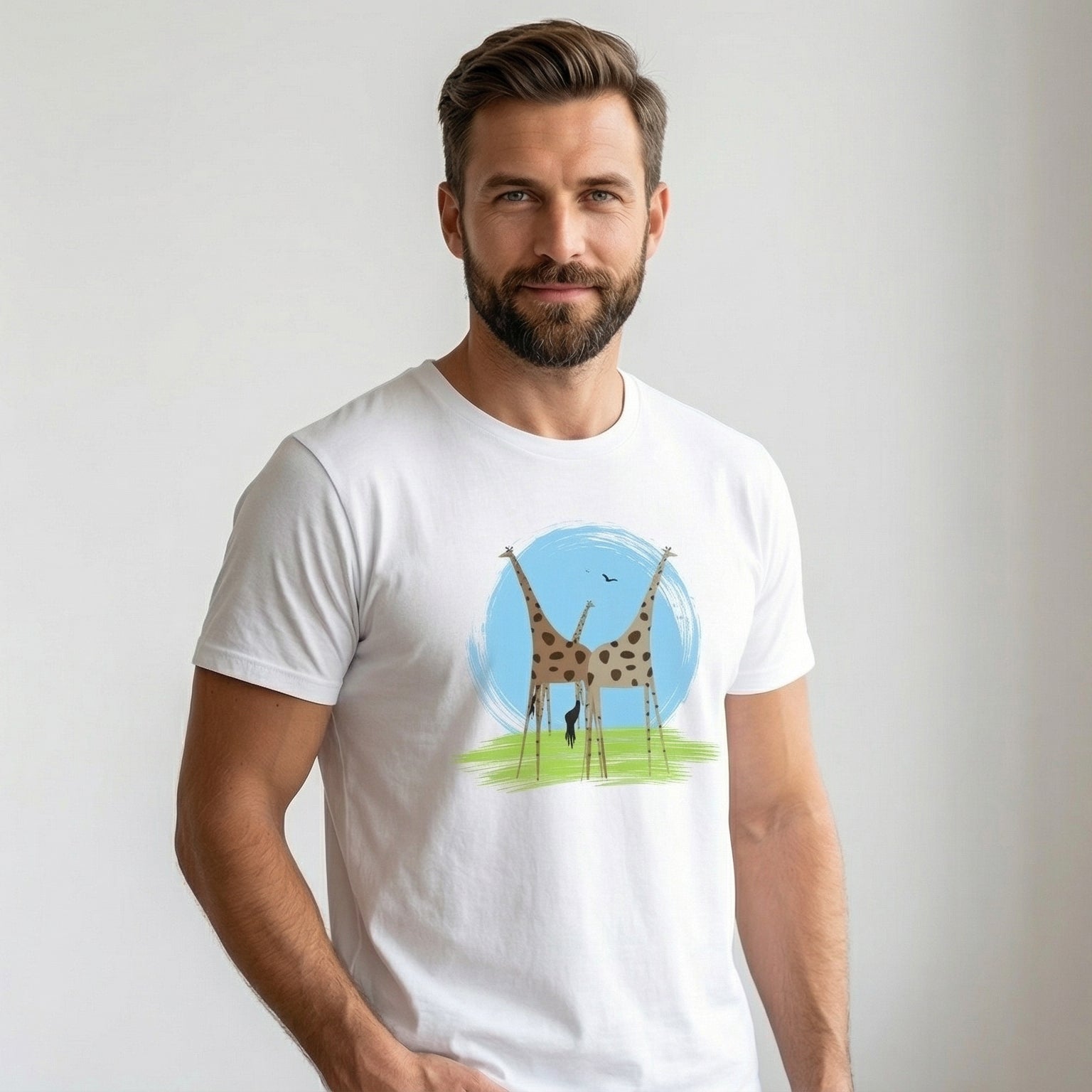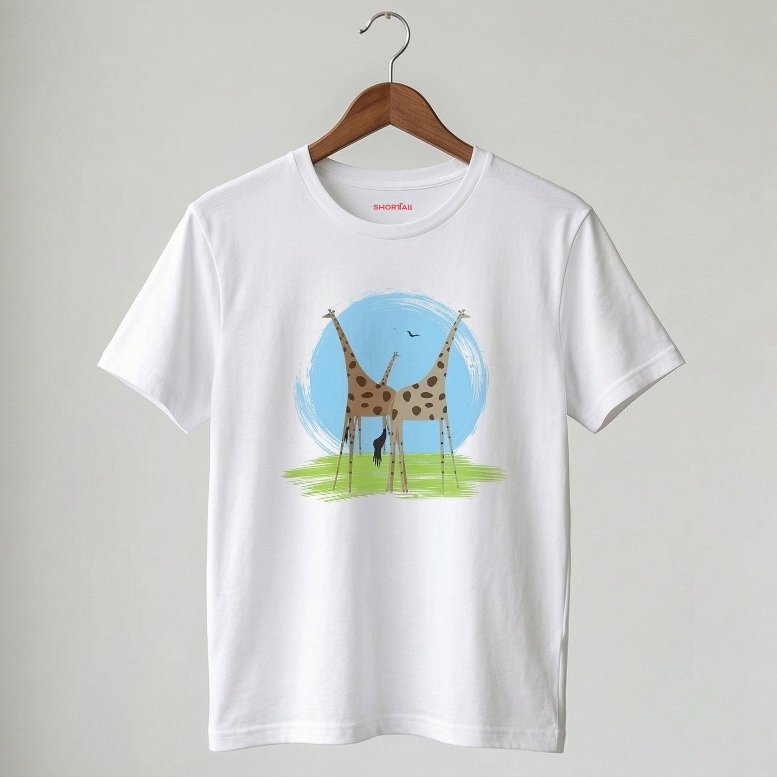 The “Twin Giraffes” Nature Edition tee captures a peaceful moment in the wild, featuring two elegant giraffes standing against a soft sky-blue artistic backdrop. The minimal illustration style brings together nature, simplicity, and modern design.